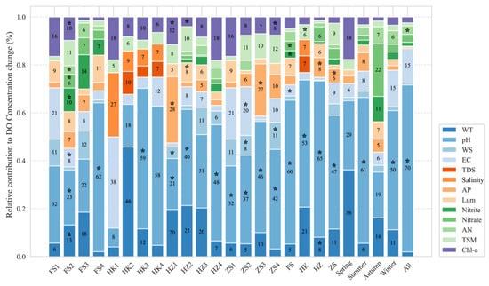As shown in Figure 14, the DO concentration exhibited the strongest correlation with the pH across four studied fishponds, whereas associations with other variables were less pronounced. Specifically, for the all-year data, the correlation coefficients between the DO and pH in the measured samples were 0.55, 0.62, 0.84, and 0.75 (p < 0.05), respectively, with the pH emerging as the most influential predictor in the LMG model. Furthermore, the pH exhibited a consistently strong positive correlation with the DO levels, both within diurnal cycles and across seasonal variations, with typical correlation coefficients exceeding 0.7 and statistical significance at the p < 0.05 level. When considering the entire dataset, the overall correlation coefficient reached 0.79 (p < 0.001), indicating a robust association. Notably, the relative contribution of the pH to the observed DO variability was approximately 70% (Figure 15), which underscores its critical role in regulating oxygen dynamics within the study area. These findings suggest that the pH serves as a key indicator of DO fluctuations in these aquatic environments. Previous studies have highlighted the critical role of the pH in DO prediction models for natural water bodies [67,68]. The strong correlation between the pH and DO is primarily driven by carbonate equilibrium and biological processes such as photosynthesis and respiration mechanisms that have been widely observed across various aquaculture settings [69,70]. In fishponds, daytime algal photosynthesis significantly reduces dissolved carbon dioxide (CO2) concentrations, leading to an increase in pH levels due to the limited dissociation of bicarbonate ions (HCO3−) required to replenish CO2 [71]. This process is further amplified under high light intensity, as photosynthesis generates substantial amounts of oxygen, which results in pronounced increases in DO concentrations. Conversely, during nighttime hours, respiration by aquatic organisms and the microbial decomposition of organic matter in sediments release CO2 while simultaneously consuming oxygen. This leads to a concurrent decline in both the DO and pH levels as the biological demand for oxygen surpasses its production [72]. This study empirically confirmed the strong positive correlation between DO and pH using field measurements from fishponds in FS, HK, HZ, and ZS, further reinforcing the critical role of pH as a key driver of DO variability in managed aquaculture systems.