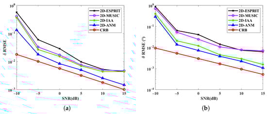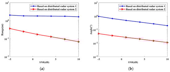 RMSE versus SNR via distributed waveform–diverse array radars: (a) Range; (b) Angle.