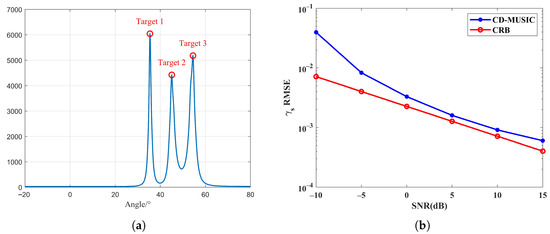 In Figure 8, the estimation results for the angle and range ambiguity index of three targets by distributed waveform diverse array radar systems have been provided. From Figure 8a, it is evident that the curves of the three targets exhibit relatively high peaks, allowing them to be clearly distinguished in the angle dimension. Furthermore, benefiting from the coding of EPC, the range ambiguity is effectively estimated in the distributed radar system, as shown in Figure 8b. It is evident from the numerical results that the RMSE curve is very close to the CRB, which shows that the system has an excellent capability for resolving range ambiguity. As a result, high-precision parameter estimation and resolution of range ambiguity can be achieved simultaneously, demonstrating the superiority of the distributed waveform diverse array radar system for target localization.