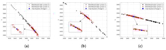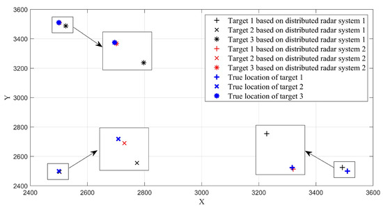 The localization results for three different targets, achieved by two distributed radar systems, are presented in Figure 9. These results represent the average values derived from 200 Monte Carlo experiments. It can be seen that the localization results of the two distributed radar systems are highly accurate, approaching the true target values and demonstrating the capability to localize multiple targets. Upon closer inspection of the enlarged block diagram, it becomes evident that the actual target locations are nearly perfectly aligned with the localization results of distributed radar system 2. As a comparison, the results of system 1 deviate slightly from the true values. Furthermore, considering the aforementioned experimental conditions, it is apparent that distributed radar system 2 exhibits superior localization performance at lower SNR levels. The advantage of the ANM algorithm, particularly in low-SNR environments, is underscored by this observation.