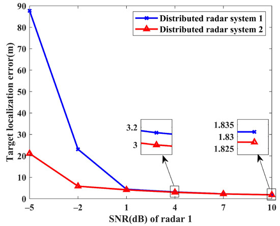 To further validate the localization performance of the methods, the localization results obtained under various SNR scenarios are presented. The baseline dataset, featuring SNR values of [−5, 5, 0], serves as our starting point. Subsequently, the SNR of radar station 1 undergoes adjustment and is systematically elevated. Furthermore, to maintain the SNR ratios observed in the initial dataset, the SNRs of the other two radar stations are also adjusted accordingly. Similarly, 200 Monte Carlo simulations are conducted to verify the estimation accuracy. The average error trends of the three targets versus the SNR variation at radar 1 are shown in Figure 11. Under the same conditions, distributed radar system 2 demonstrates excellent performance improvement compared to system 1. The performance gap between the two systems gradually decreases with an increasing SNR and stabilizes at higher SNRs. Specifically, system 2 achieves a 75.9% improvement in target localization accuracy compared to system 1 at SNR = −5 dB, maintaining this advantage across all evaluated SNR values.
