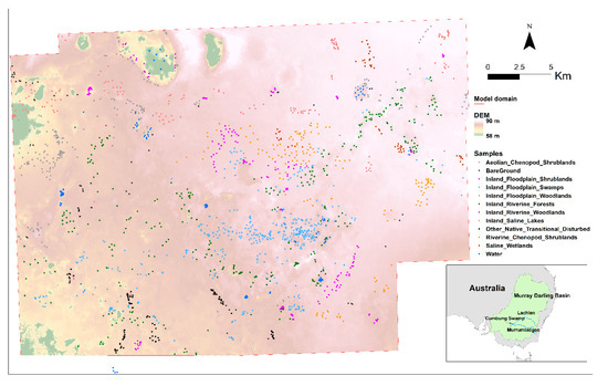Vegetation samples in the Great Cumbung Swamp, located in the lower Lachlan River. The background features a gap-filled 5 m DEM, used to calculate 20 hydro-geomorphic variables. The inset map highlights the study site at the confluence of the Lachlan and Murrumbidgee Rivers, two major river systems in the Murray–Darling Basin, Australia.