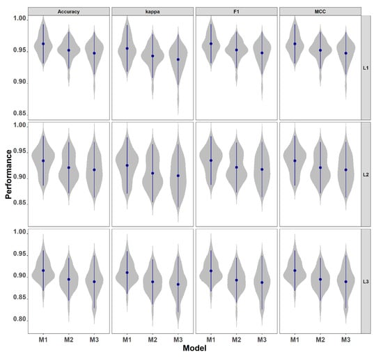 A second major pattern was the decrease in model performance with increasing thematic resolution. Across all model types, classification accuracy declined from L1 (9 classes) to L2 (14 classes), and further to L3 (23 classes) (Table 2). For the full model, overall accuracy decreased from 0.97 at L1 to 0.94 at L2, and 0.93 at L3. Similar declines were observed for kappa, weighted F1, and MCC. This trend reflects the increasing spectral and ecological similarity among classes at a higher classification detail, which presents greater challenges for model discrimination.