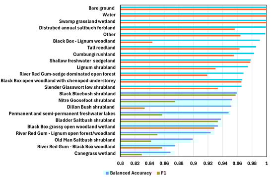The Cane-grass Wetland class had the lowest classification performance among the 23 PCTs, with a balanced accuracy of 0.87 and an F1 score of 0.83. However, even this represents a high level of classification accuracy when compared with similar studies in wetland environments, where class-specific F1 scores for detailed vegetation types often range between 0.70 and 0.85 [16,18]. The moderate reduction in accuracy for Cane-grass Wetland may be attributed to its spectral and structural similarity with adjacent communities such as Tall Marsh or Mixed Wetlands, as well as potential seasonal overlap in phenological characteristics. Misclassification may also be more likely where vegetation occurs in transitional zones or exhibits subdominant growth forms within mixed patches.
