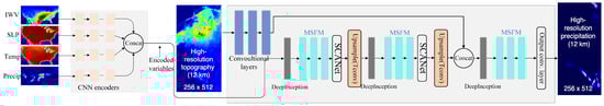 Precipitation variability is influenced by a wide range of factors, which constitutes a core focus of this study. Inspired by the physical mechanisms of precipitation, we extend the input variable set beyond the super-resolution (SR) model proposed by Vandal et al. [10]. In addition to low-resolution precipitation and high-resolution topographic data, we incorporate several additional meteorological variables—Integrated Water Vapor (IWV), Sea Level Pressure (SLP), and 2 m Air Temperature (T2)—as supplementary inputs (see Table 1). All these variables are obtained from the same WRF simulation dataset driven by NCEP-R2 reanalysis data. These atmospheric variables exhibit strong temporal correlations with precipitation and provide richer physical context, thereby enhancing the model’s ability to characterize precipitation distributions. Each meteorological variable displays clear spatial dependencies, making their data structure somewhat analogous to that of images. However, unlike conventional image data, meteorological data are often sparse, dynamic, and highly nonlinear, presenting greater challenges for model learning. To ensure the validity of the input data, we applied several preprocessing steps to the precipitation data. Specifically, a minimum precipitation threshold of 0.05 mm per 3 h was set for each grid cell to eliminate the influence of light rain or no-rain conditions that could interfere with neural network training. In addition, the upper bound of precipitation values was capped at the 99.5th percentile to prevent extreme precipitation events from disproportionately affecting the loss function, thereby improving the stability of model training.