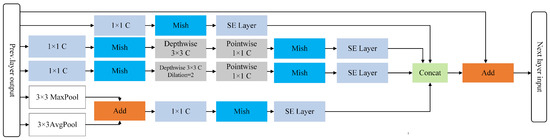 where denotes the depthwise convolution, denotes the pointwise convolution, and is the nonlinear activation function. Compared with standard convolution, this operation can effectively reduce computational complexity.