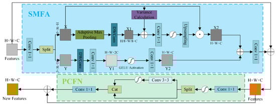 In precipitation image super-resolution tasks, the model needs not only to accurately recover spatial details but also to enhance multi-scale feature representation capabilities, in order to effectively fuse both local and global information. To address this, we propose the Multi-Scale Feature Modulation (MSFM) module, as illustrated in Figure 3. This module improves the model’s feature representation ability through adaptive feature aggregation and a dynamic feature modulation mechanism, thereby further enhancing super-resolution reconstruction performance. MSFM mainly consists of the following two components: Self-Modulated Feature Aggregation (SMFA) and the Partial Convolutional Feedforward Network (PCFN). Among them, SMFA is responsible for adaptive modulation across multi-scale features, while PCFN leverages partial convolution operations to locally enhance features, thereby improving the model’s nonlinear representational capacity.