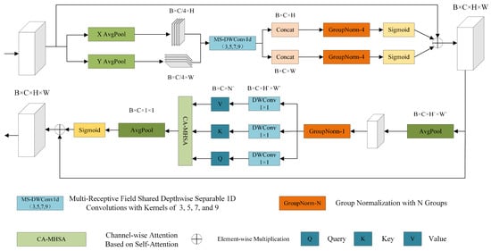 In the task of precipitation super-resolution, accurately capturing both local and global features of precipitation images is crucial. To enhance the model’s ability to identify precipitation regions, we propose a Spatial-Channel Attention Network (SCAN) module, which strengthens the interaction between spatial and channel information during feature extraction, as illustrated in Figure 4. SCAN integrates a multi-scale convolutional spatial attention mechanism with a self-attention-based channel attention mechanism. The spatial attention component models both short- and long-range spatial dependencies by introducing multi-scale depthwise convolutions along the height and width dimensions. Meanwhile, the channel attention component leverages a multi-head self-attention mechanism to model dependencies along the channel dimension, thereby improving the model’s focus on salient features.