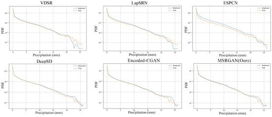 Figure 5 presents a comparison of the probability density functions (PDFs) between predicted and true values for six different super-resolution methods—VDSR, LapSRN, ESPCN, DeepSD, Encoded-CGAN, and MSRGAN (Ours)—applied to precipitation field downscaling reconstruction. The PDF distributions are displayed on a logarithmic scale to highlight differences in low-probability regions. The results demonstrate that while all methods show relatively similar PDF fitting performance in the low-to-moderate precipitation intensity range, significant divergences emerge in the high-intensity precipitation region (exceeding 10 mm). Traditional deep learning approaches such as VDSR, LapSRN, and ESPCN exhibit limited capability in modeling the distribution tails, as evidenced by substantially lower predicted value densities compared to true values in high precipitation intensity areas. Conversely, generative adversarial network-based methods, particularly Encoded-CGAN and our proposed MSRGAN, demonstrate enhanced ability to capture heavy-tail characteristics. Notably, MSRGAN’s predicted distribution maintains close alignment with the true distribution across the full spectrum of precipitation intensities, indicating superior performance in both spatial resolution enhancement and precipitation intensity modeling. The comprehensive PDF analysis reveals that MSRGAN achieves the highest distribution fidelity among all compared methods, demonstrating its superior capability to preserve the statistical properties of high-resolution precipitation fields during the super-resolution process.