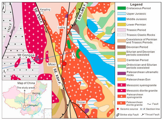 - Zhang, L.; Zhou, Y.; Zhang, X.; Zhu, A.; Li, B.; Wang, S.; Liang, S.; Jiang, C.; Wu, J.; Li, Y.; et al. 2022 Mw 6.6 Luding, China, Earthquake: A Strong Continental Event Illuminating the Moxi Seismic Gap. Seismol. Res. Lett. 2023, 94, 2129–2142. [Google Scholar] [CrossRef]