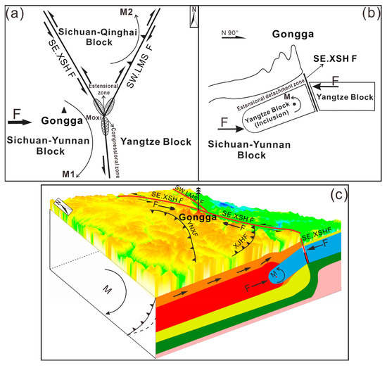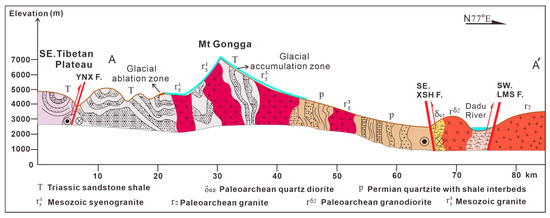 - Roger, F.; Calassou, S.; Lancelot, J.; Malavieille, J.; Mattauer, M.; Zhiqin, X.; Ziwen, H.; Liwei, H. Miocene emplacement and deformation of the Konga Shan granite (Xianshui He fault zone, west Sichuan, China): Geodynamic implications. Earth Planet. Sci. Lett. 1995, 130, 201–216. [Google Scholar] [CrossRef]