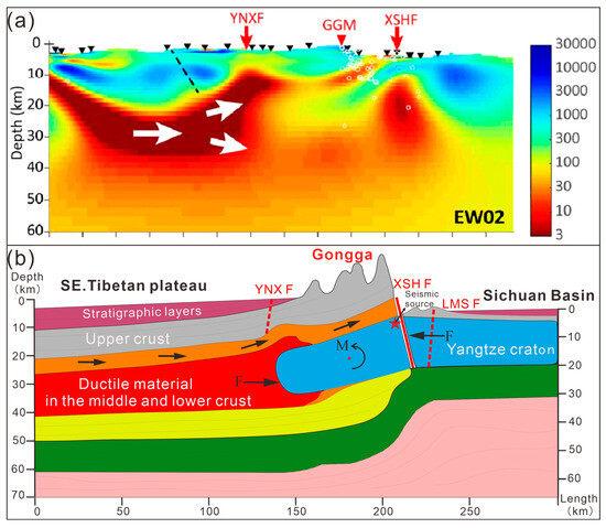 - Bai, D.; Unsworth, M.J.; Meju, M.A.; Ma, X.; Teng, J.; Kong, X.; Sun, Y.; Sun, J.; Wang, L.; Jiang, C.; et al. Crustal deformation of the eastern Tibetan plateau revealed by magnetotelluric imaging. Nat. Geosci. 2010, 3, 358–362. [Google Scholar] [CrossRef]