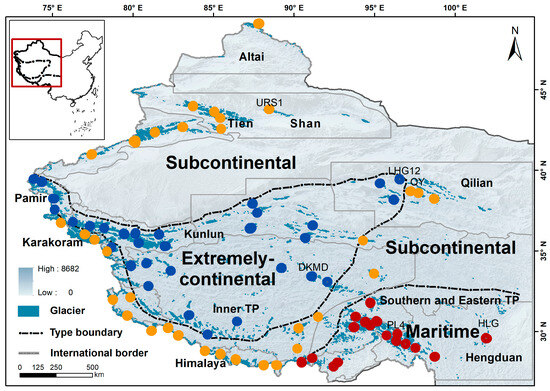 Distribution of three different types of glaciers in China. Glacier outlines are indicated by light blue polygons. Gray outlines indicate the HMA subregions located in China. The dashed lines indicate the boundaries of the glacier type regions based on the Shi–Xie classification. The blue, yellow, and red dots indicate the selected extremely continental, subcontinental, and maritime glaciers, respectively. The background image is the USGS GTOPO30 DEM. The inset shows the location of glacierized regions in China.