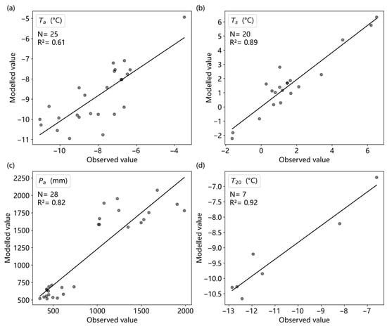We further validated the calculated glacier criteria at the ELA, including Ta, Pa, Ts, and T20, with available observations. As shown in Figure 3, the modeled values generally show strong agreement with observations, with R2 values ranging from 0.61 to 0.92. The highest correlations were observed for Ts and T20, indicating good model performance for summer and near-surface ice temperatures. While some discrepancies remain, particularly for Ta, the overall results demonstrate the reliability of the calculated criteria within the Shi–Xie classification framework.