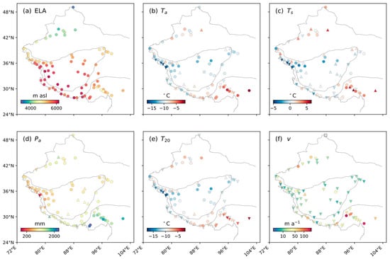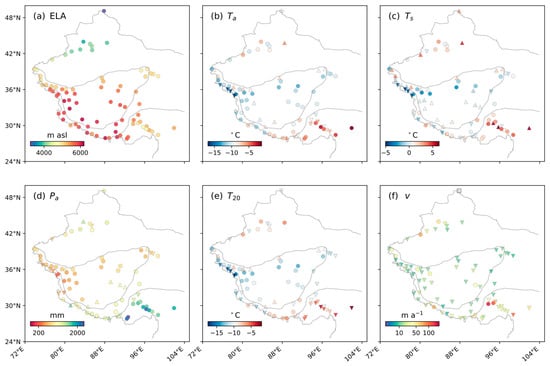 Distribution of ELAs and classification criteria over the period 1982–2000. (a) ELA, (b) Ta, (c) Ts, (d) Pa, (e) T20, (f) v. Circles indicate that there are no changes in individual glacier criteria relative to the threshold of their corresponding glacier type. Upper triangles indicate that the criterion values for individual glaciers exceed the thresholds of their respective glacier types, while lower triangles indicate that the criterion values fall below these thresholds. The square in panel (f) indicates glaciers with no velocity data.