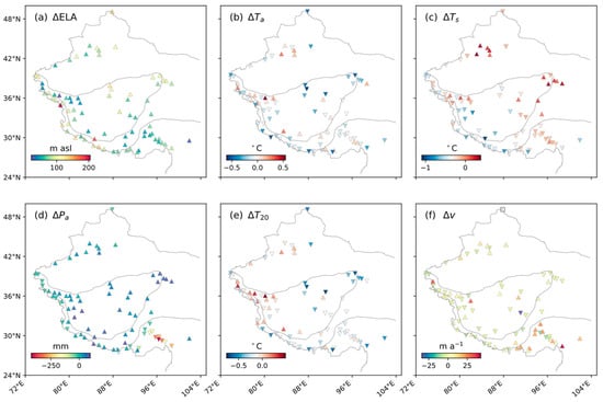 Difference maps of ELA and classification criteria between the periods 2001–2019 and 1982–2000. (a) ΔELA, (b) ΔTa, (c) ΔTs, (d) ΔPa, (e) ΔT20, (f) Δv. Upper (lower) triangles indicate that the differences are positive (negative). The square in panel (f) indicates no velocity data for this glacier. Ta, (c) Ts, (d) Pa, (e) T20, (f) v.