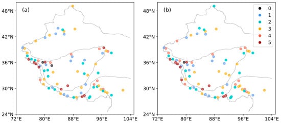 Figure 7 illustrates the spatial distribution of glaciers deviating from classification thresholds during the periods 1982–2000 and 2001–2019. The overall pattern remained relatively consistent across both periods. Glaciers with the highest number of deviations were primarily concentrated in the Karakoram, western Kunlun Mountains, Qilian Mountains, and maritime glacierized regions. In contrast, only two glaciers in the first period and one in the second remained entirely within the classification thresholds, all of which belong to the extremely continental type. Notably, glaciers with all five classification criteria exceeding the thresholds were clustered in the Karakoram and western Kunlun Mountains, underscoring these regions as key transition zones. Glaciers in the Tien Shan and inner TP showed relatively fewer deviations from the thresholds, while those at the boundaries between glacier types exhibited a marked increase in classification deviations.