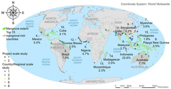 Study areas where GEE was used for mangrove RS. The 2020 Global Mangrove Watch (GMW) Version 3.0 data was used to show mangrove extent [62].
