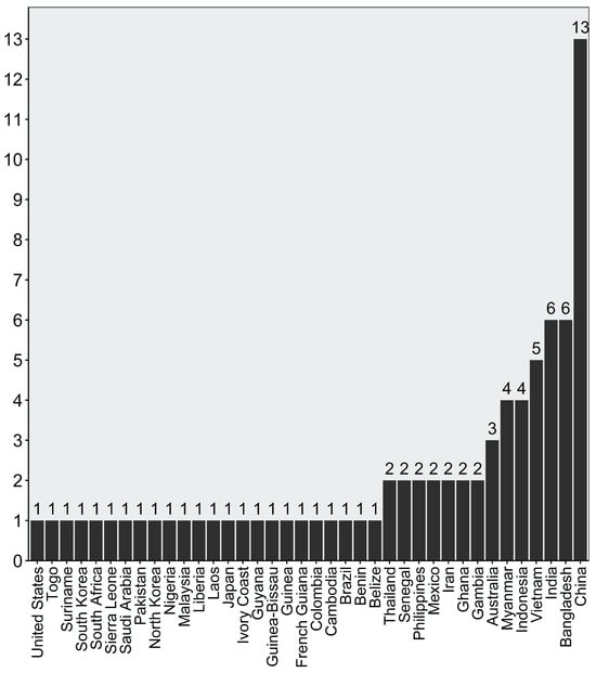 The number of articles that examined mangroves in various countries. Note that some papers considered more than one study site.