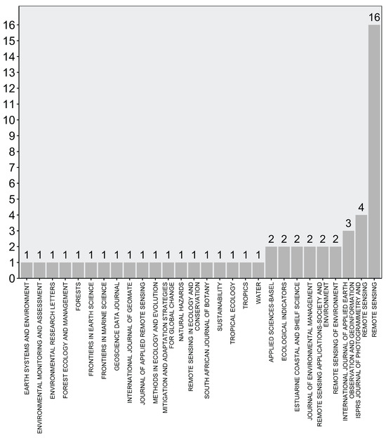 Some papers stated whether their research focused on mangrove regions at the regional or project level. However, where it was unclear, the corresponding authors were contacted. In the context of our present study, a project-scale study is defined as one that examines a smaller portion of a larger mangrove forest present on a national or regional scale. Out of 54 studies, about 65% (35 studies) focused on country- or regional-scale, while around 33% (18 studies) were local- or project-based. There was only one article that focused on both regional and project-scale study areas. Again, although not in the top 15 mangrove-rich countries list, the majority of studies that used GEE were concentrated in China (Figure 2). There were eight country-wide, three regional-scale, and two project-scale studies that considered the Chinese territory. Six studies considered the Bangladesh part of the Sundarbans mangrove forest, and three studies considered the Indian part. Three regional and two project-scale studies were conducted in Vietnam. It is to be noted that despite being the most mangrove-rich country, Indonesia had only one regional-scale and three local-scale studies. Myanmar was examined in three regional and one project-scale studies. Australia was the subject of two regional and one project-scale studies. In other parts of the world, two or fewer studies were conducted. Most articles were published in Remote Sensing, an open-access journal by MDPI (Multidisciplinary Digital Publishing Institute; Figure 3).