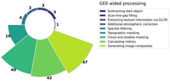Almost all 54 papers have at least leveraged the basic utility of GEE, that is, data extraction and preprocessing. A wide range of GEE-based preprocessing techniques were used to improve the usability of satellite imagery (Figure 5). Clearly, the most popular was generating image composites (47 out of 54 articles). As indicated by their occurrence in 42 and 40 papers, respectively, calculating indices and cloud and shadow masking were the next most used preprocessing steps. The significance of topographic masking in mangrove research was addressed in 19 articles. Speckle filtering, a method intended to mitigate noise in radar images, has been adopted in four papers. Other preprocessing approaches include extracting texture information via Grey Level Co-occurrence Matrix (GLCM), scan-line gap filling, additional atmospheric correction, and subtracting dark objects.