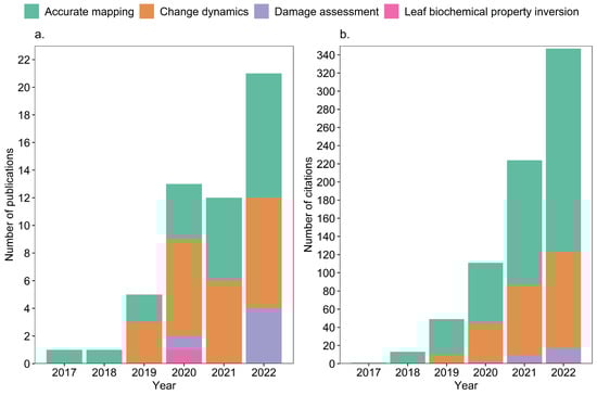 GEE has been widely used by researchers for accuracy assessment (in different subfields) (Figure 9). Except for 2021, the number of publications using GEE for accuracy reporting has increased every year. In addition, citations of papers reporting accuracy are on the rise.