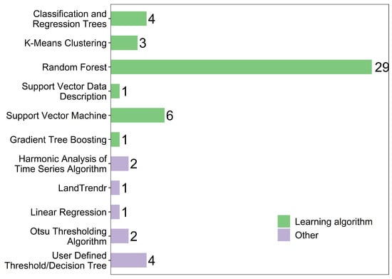 A key area where the cloud-based processing framework of GEE has been leveraged is through the application of sophisticated image processing algorithms (Figure 6). Learning-based algorithms for mangrove modeling (or classification) include Classification and Regression Trees [64], Gradient Tree Boosting [65], K-means clustering [66], Random Forests [67], Support Vector Machine [68], and Support Vector Data Description [69]. Other algorithms have been structured in GEE by authors from scratch (Harmonic Analysis of Time Series Algorithm [70]; Otsu Thresholding Algorithm [71]) or have built-in GEE (LandTrendr [72]; Linear Regression [73]). Some authors also used user-defined threshold/decision trees [74].