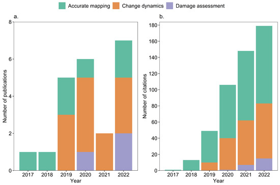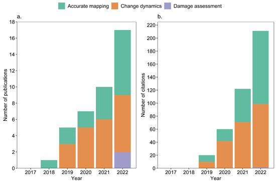 RS-based mangrove studies that utilized GEE-based modeling and (or) algorithm: (a) number of publications per year from 2017 to 2022 and (b) number of citations per year from 2017 to 2022.
