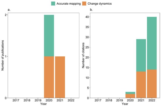 RS-based mangrove studies that utilized GEE for accuracy assessment: (a) number of publications per year from 2017 to 2022 and (b) number of citations per year from 2017 to 2022.