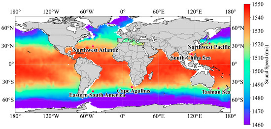 The global sea surface sound speed distribution in January 2004. The regions are the Northwest Pacific (35°N, 145°E), the Northwest Atlantic (30°N, 130°W), the Cape of Agulhas region (38°S, 15°E), the Tasman Sea off eastern Australia (40°S, 160°E), Eastern South America (45°S, 130°W), and the South China Sea (17°N, 115°E), respectively.