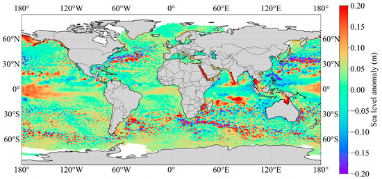 The SLA data are sourced from the satellite altimetry product data of the French Archiving Validation and Interpretation of Satellite Oceanographic (AVISO). The dataset provides sea surface height information with a spatial resolution of 0.25° × 0.25° and a temporal resolution of weekly, covering the global ocean, which can reflect the SSH changes caused by the ocean dynamic process. Figure 2 is the distribution of global SLA in January 2004.