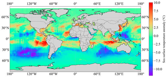 This processing method holds significant research importance: Firstly, the utilization of the anomaly form can effectively eliminate the influence of varying physical dimensions, enhancing compatibility and comparability among multi-source data. Secondly, this unified data representation approach substantially improves neural networks’ capability to learn complex oceanic features, thereby optimizing the training process. Thirdly, through standardized preprocessing of input data, the accuracy and reliability of SSP inversion can be significantly enhanced. Figure 3 is the global SSTA distribution in January 2004 derived from AVHRR based on the above three steps.