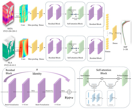 The Res-SACNN model is designed in this study (the residual network and the self-attention mechanism are added based on the CNN model), with inputs being multi-layer SSTA and SLA, and output of one training being an SSP (the output of one experiment is SSPs at 9 points within a horizontal spatial range of 2° × 2°). For multi-source data with different resolutions, the main approach in this study is to use dual-channel input, separately processing SSTA and SLA, establishing two parallel CNNs, and then merging the two channels to achieve multi-source data fusion. Each sub-channel includes convolutional layers, pooling layers, and embeds two residual networks and one self-attention mechanism. The residual network block includes two layers of batch normalization and two layers of convolution, where the ReLU activation function is used. The self-attention mechanism block consists of channel attention and spatial attention. For channel attention, it first passes through a flatten layer and then two fully connected layers, with the activation functions being ReLU and Sigmoid, respectively. The spatial attention mainly uses a dilated convolution layer to increase the receptive field, and finally outputs through the Sigmoid activation function (As shown in Table 2). Considering the differing degrees of influence of SSTA and SLA on SSP inversion, this paper assigns different weights to the two channels, determining that SLA: SSTA = 1.50:1.00, and finally merges the channel outputs to inverse the SSP with 58 layers.