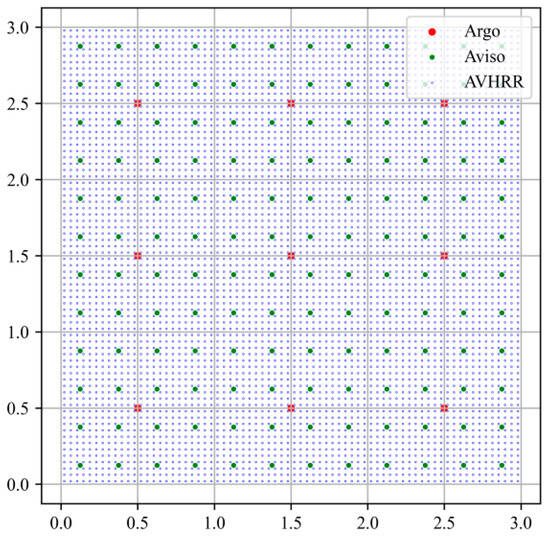 Considering the limitations of a single data source, we adopt multi-data fusion technology to effectively integrate various types of sea surface data. By designing a specialized feature extraction network and fusion strategy, the accuracy of feature extraction and the precision and generalization performance of SSP inversion are improved. After obtaining multi-source data, the data itself is processed first. For sea surface data, there are phenomena such as data missing and data anomalies. In this study, the multi-source data are all corrected. At the same time, to achieve the fusion of multi-source data, grid point matching is carried out for data with different resolutions, the grid matching forms of various data are observed, and then the data matching method is determined. Figure 5 is the multi-source data grid point diagram, which demonstrates grid point matching for Argo data, AVHRR data, and AVISO data. This process ensures the consistent expression of each data type at the same grid point through the precise matching of the three types of data in the spatial dimension. The main data fusion method in this paper is reflected in the construction of the model architecture.