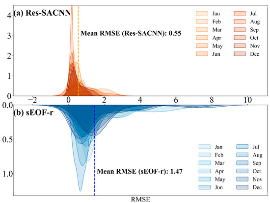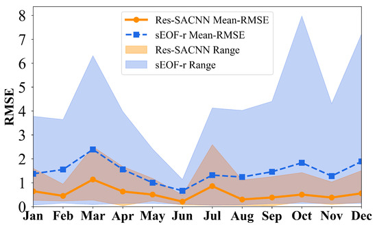 We also provide a detailed statistical analysis of the average RMSE for each month (Figure 8). In all months, the changing trend of the overall RMSE of the inversion of the Res-SACNN model shows a similar situation to the traditional sEOF-r method. It can be seen from the above figure that the Res-SACNN model shows obvious advantages: On the one hand, the RMSE value of this model is smaller, indicating that the deviation between its inversion result and the true value is relatively smaller and the inversion accuracy is higher; on the other hand, the fluctuation range of its RMSE is also more minor, which means that the inversion performance of the Res-SACNN model is more stable between different months, and is less affected by external factors or data changes.