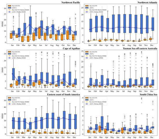 To comprehensively evaluate the performance of the Res-SACNN model in the time dimension, we select data from all months throughout the year to cover the impact of seasonal variations on the SSP. Taking the South China Sea as an example, the inversion results of different months are compared and analyzed. The key points to focus on are: whether the model’s performance is stable during periods with significant seasonal changes (such as the transition periods between spring-summer and autumn-winter); the changing trend of the RMSE distribution between different months to verify the model’s sensitivity to temporal dynamic changes; comparing the performance of the sEOF-r method in the same period to highlight the advantages of the Res-SACNN in time series inversion and evaluate the model’s adaptability to different time domains.