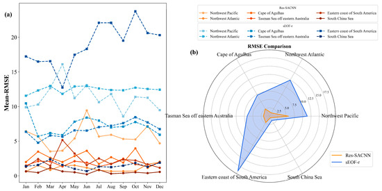 In addition, we analyze the experimental data of six typical regions to comprehensively compare the performance of this model using the sEOF-r method. These regions cover a variety of scenarios from the active areas of marine dynamics to the relatively stable environments to ensure the comprehensiveness and representativeness of the evaluation results. Figure 10 shows the RMSE of six regions. Figure 10a shows the RMSE statistics for different months, where the blue represents sEOF-r and the orange represents Res-SACNN; Figure 10b shows the annual average RMSE in six areas. Res-SACNN shows a smaller RMSE and has a more stable SSP inversion performance in various months and six regions.