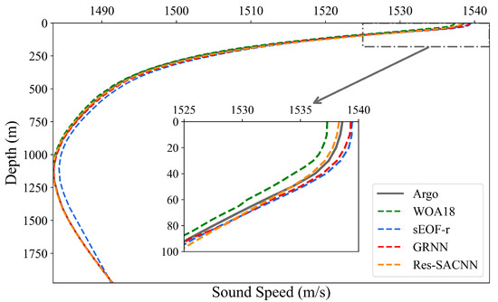 Machine learning has developed rapidly in the field of SSP inversion, and many models have also achieved good inversion results. We use the generalized regression neural network (GRNN) [12] as the comparison object for the evaluation experiment of Res-SACNN. The GRNN model is mainly used to establish a nonlinear mapping relationship between sea surface parameters (SLA and SSTA) and SSP. During its use, the coefficients need to be obtained first using the sEOF method, then these coefficients are input into the GRNN model, and finally the SSP is output. Taking the South China Sea as an example, we used different methods (WOA18, sEOF-r, GRNN, Res-SACNN) to perform monthly inversion of SSP. To show the overall accuracy of various models, we average the monthly inversion results for the whole year and obtained the final annual average SSP inversion results. Figure 11 shows the measured Argo data, the WOA18 climatological data, the inversion of sEOF-r, the inversion of GRNN, and the inversion of Res-SACNN. Overall, the SSP results of several types of methods can fit the measured Argo data well. However, it is evident that the Res-SACNN model exhibits the highest degree of coincidence with the Argo data in the sea surface region ranging from 0 m to 100 m, especially.