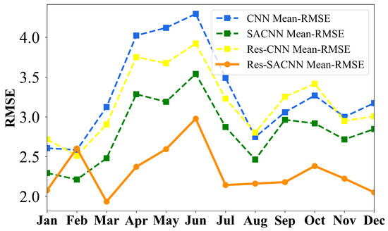 The average RMSE of six regions. The blue dotted line represents the CNN model, the green dotted line represents the SACNN model, the yellow dotted line represents the Res-CNN model, and the orange solid line represents the Res-SACNN model.