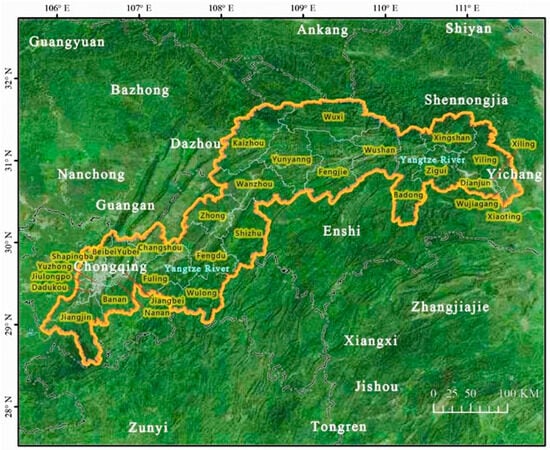 The Three Gorges Reservoir Area (TGRA) is located at the middle and lower reaches of the Yangtze River [27,29,30,31], involving 30 counties of Chongqing Municipality and Hubei Province, covering 106°16′–111°28′E and 28°56′–31°44′N, with a total area of approximately 58,000 km2 (Figure 1). The TGRA was formed due to the construction of the Three Gorges Dam (TGD), with water impoundment beginning in 2003 and reaching its final level of 175 m in 2010 [29]. Geomorphologically, the TGRA is situated at the intersection of three tectonic units. The topography is high in the east and low in the west. Approximately 74% of the TGRA is mountainous, 22% is hilly, and only 4% is plains or dams [32]. The TGRA is situated in a subtropical humid monsoon climate zone. It experiences humid conditions for most of the year, with an annual mean temperature of 17–19 °C. The temperature generally decreases from northwest to southeast. Annual precipitation ranges from 1000 to 1300 mm, with higher values in the southeast and northwest, and lower values in the northeast and southwest [33].