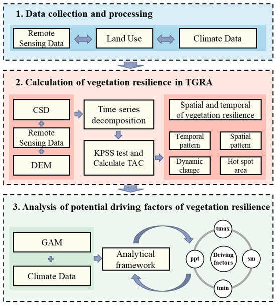 This study, therefore, made the attempt to comprehensively analyze the dynamics of vegetation resilience in the TGRA throughout the past 20 years by (1) verifying the effectiveness of vegetation resilience monitoring, (2) determining the distribution and dynamic characteristics of vegetation resilience on the TGRA, and (3) analyzing the potential driving factors of vegetation resilience.