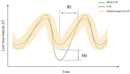The Disturbance Event Model (DEM) assessed the maximum anomaly degree (Ms) and the duration from the maximum anomaly to the return to normal range (Rt) for LAI under recoverable conditions, with resilience being calculated by using their ratio (Figure 4) [17,52]. This study defined a situation where LAI fell below the normal floating range (mean ± one standard deviation) as a vegetation anomaly caused by natural disturbances. The multiyear monthly mean value and monthly standard deviation of LAI were utilized to establish the normal fluctuation range of LAI variations. When LAI dropped below this range, the minimum LAI value was identified as the starting point of vegetation recovery. The difference between this minimum LAI value and the lower limit of the floating range at that specific time represents the maximum anomaly degree (Ms) of LAI under recoverable conditions. Concurrently, the time when LAI returns to the normal range marks the end of disturbance recovery. The duration from the start to the end is defined as the time from maximum abnormality to normalization (Rt). The ratio Ms/Rt was then calculated for each disturbance event, representing the pixel-level resilience during each disturbance episode. Given that multiple disturbance events frequently occurred during the monitoring period from 2000 to 2018, we calculated the vegetation resilience for each disturbance event within each pixel individually. We then took the mean value of the vegetation resilience across all disturbance events as the finally result: