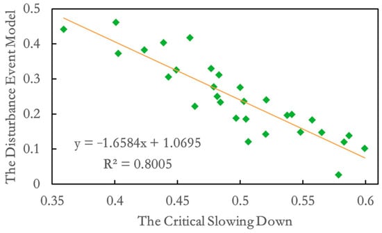 We performed a correlation analysis between the resilience estimates derived from the DEM and those obtained from the CSD method to assess their spatial agreement. The DEM focuses on quantifying resilience by analyzing specific disturbance events and the recovery process. DEM is well suited for studying ecosystems with clear disturbance–recovery cycles, such as vegetation responses to droughts, floods, or other discrete events. A low ratio in the DEM indicates a long recovery time under the same intensity, which indicates low resilience. For the selection of the β parameter in the DEM calculation formula, we utilized a landslide case study from Fengjie in 2017 and constructed a DEM schematic diagram based on Leaf Area Index (LAI) data. Our analysis revealed that setting the β parameter to 1 allowed for clear monitoring of the onset and cessation of disturbances (Supplementary Figure S5). The correlation results show that the CSD is negatively correlated with DEM, indicating that the CSD has good applicability in the TGRA.