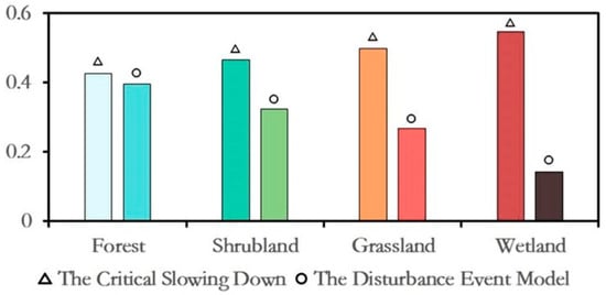 The Critical Slowing Down (CSD) and the Disturbance Event Model (DEM) are both based on the concept of resilience, but they differ in their calculation methods and the range of indicators they use. Given the methodological differences between CSD and DEM, a direct comparison was not feasible; instead, we conducted a spatial consistency and accuracy assessment to evaluate the agreement between the two resilience metrics. The results revealed highly relevant patterns between the CSD and DEM, with an R2 value of 0.80 at the district level. Xingshan, Wuxi, and Yiling exhibited high vegetation resilience, whereas Jiangbei, Dadukou, and Nan’an exhibited low vegetation resilience (Figure 5). Additionally, the CSD and DEM showed consistency among the various vegetation types (Figure 6). Forests and shrublands exhibit high resilience, whereas grasslands and wetlands exhibit low resilience (Figure 7). Although there was an overall consistency, some small differences were found between the results from the two models. The CSD showed that Wulong exhibited the eighth-highest vegetation resilience in the TGRA, whereas the DEM showed that Wulong exhibited the third-highest vegetation resilience. Moreover, the CSD showed that Yuzhong exhibited the fourth-lowest vegetation resilience, whereas the DEM showed that Yuzhong exhibited the lowest vegetation resilience.