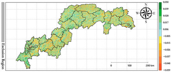 Overall, vegetation resilience in the TGRA showed a decreasing trend. Specifically, the vegetation resilience of Jiulongpo, Jiangjin, Shapingba, Jiangbei, and Dadukou presented a significant decreasing trend, with annual TAC change rates of 0.62%, 0.56%, 0.45%, 0.45%, and 0.40%, respectively, whereas Yubei, Fuling, and Xingshan presented slight increasing trends. The vegetation resilience of Dianjun, Yuzhong, and Wuxi showed an upward trend from 2001 to 2018, with TAC change rates of −0.25%, −0.15%, and −0.02%, respectively. In addition, Central Yiling, East Fuling, West Wulong, and South Dianjun showed significant increasing trends in vegetation resilience (Figure 10).