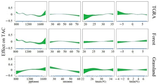 Statistical analysis revealed that ppt, tmax, tmin, and sm were significantly associated with TAC (Figure 11). Specifically, ppt exhibited a fluctuating effect on TAC in the TGRA and forest from 800 mm/yr to 1800 mm/yr. In the range from 800 mm/yr to 1100 mm/yr, ppt exhibited a positive effect on TAC, and the effect decreased as ppt increased. With increasing ppt, the effect became negative from positive, and the negative effect continued to grow until ppt reached 1600 mm/yr. When ppt exceeded 1600 mm/yr, its impact on TAC shifted from negative to positive as ppt increased. Notably, the effect of ppt on grassland was the exact opposite of its effect on the TGRA and forests. Between 800 mm/yr and 1200 mm/yr, ppt exhibited a negative effect on TAC, and the effect decreased as ppt increased. As ppt continued to rise, the effect transitioned from negative to positive and continued to grow until ppt reached 1800 mm/yr, where the positive effect peaked.