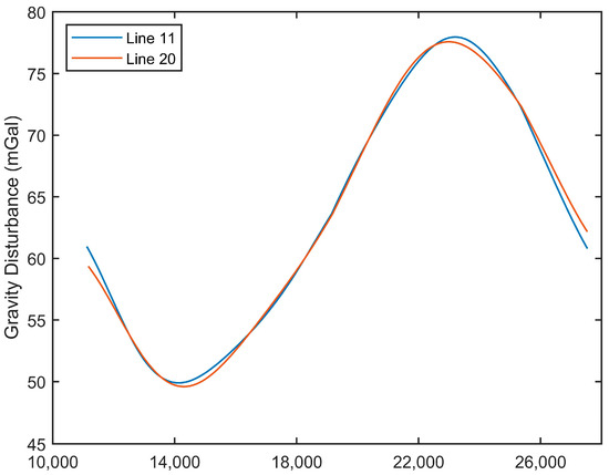 Comparison of gravity disturbance distribution along line nr. 11 and line nr. 20. The two lines were flights following the same heading. See their locations in Figure 1C (green solid lines).