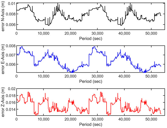 Positioning errors along the N (north; black colored line), E (east; blue colored line), and Z (vertical, red colored line) axes of GNSS data collected on board the aircraft. The results are referenced using base station corrections (see Figure 1C and Table 1 for the geographic positions). The horizontal axis represents time in seconds, while the vertical axes represent the error magnitude in meters for each respective component.