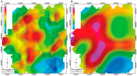 Airborne gravity disturbance distribution in the Sos Enattos region ranges between 8 and 85 mGal, displaying a distinct pattern primarily characterized by three prominent positive anomalies roughly aligned in a N–S direction (Figure 4A). In contrast, the eastern sector exhibits a series of E–W to SW–NE elongated mid-high anomalies (~60 mGal) that enclose a relative gravity minimum (~25 mGal). The southeastern sector of the study area features the lowest gravity anomalies, ranging between 8 and 20 mGal. This observed gravity pattern is strongly correlated with the morphological features of the area, where topography plays a dominant role in shaping the gravity disturbance signal. The Sos Enattos area is located in a hilly-mountainous region, characterized by NE–SW elongated structural highs that reach elevations exceeding 1000 m (e.g., Monte Albo, 1127 m a.s.l.; Figure 1) and are interspersed with narrow valleys. This rugged morphology results from a NE–SW fault system, which has tectonically deformed the Hercynian–Variscan basement and the overlying Mesozoic–Eocene sedimentary sequences [44,48,49] (Figure 1). The Sos Enattos mining site, situated at an altitude of 304 m, lies southwest of Monte Albo. From a gravity perspective, this sector is characterized by a moderate to low gravity disturbance (30–35 mGal), distinctly contrasting with the higher anomalies in the surrounding regions.