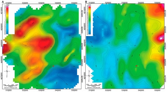 (A) Gravitational contribution of the topography of the Sos Enattos region (See DEM in Figure 1C). (B) Complete Bouguer disturbance obtained by subtracting the gravity effect of the topography from the gravity disturbance (Figure 4A). The red filled dot identifies the geographical position of the Sos Enattos mining site.